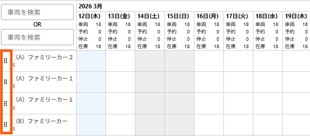 在庫カレンダーに並ぶ車の順番はどこを基準にしていますか? 在庫カレンダー上に表示される車両につきましては、【新しく登録された車両ほど上に表示される】仕様になっております。 なお、在庫カレンダーに表示される車両の順番は【車両名の左横のボタン】をドラッグ&ドロップすることでお好みの順番に変えることが可能でございます。 車両の表示順をお好みで設定したい場合はご活用くださいませ。