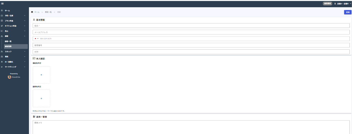 【2】顧客登録画面では、基本情報、免許証画像、顧客メモを登録できます。