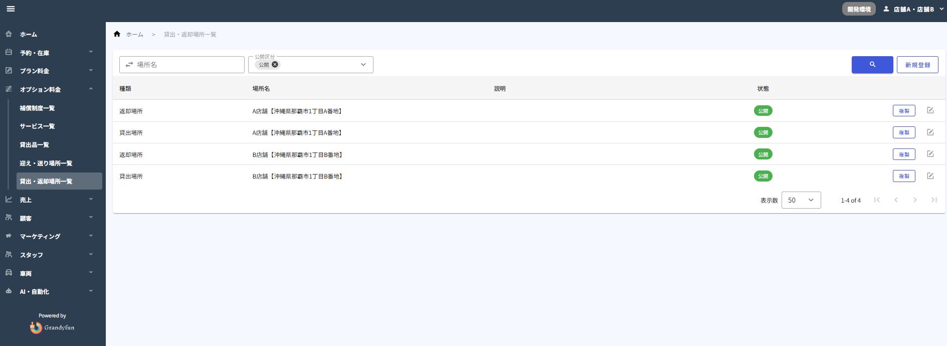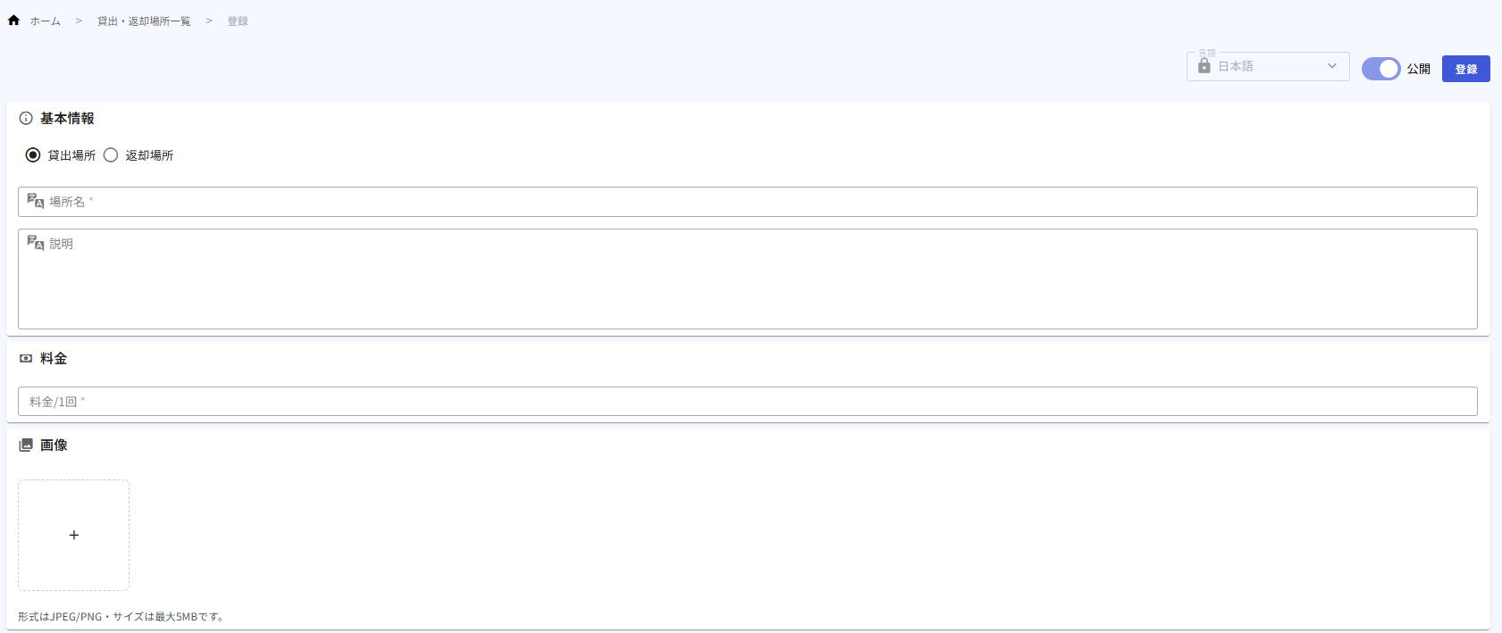 貸出・返却場所の設定方法は? 貸出場所・返却場所を設定することが可能です。 (1)サイドバーのオプション料金より貸出場所・返却場所一覧を選択することで遷移する一覧画面より新規登録をクリックします。 (2)貸出場所・返却場所のどちらを登録するかチェックを行う (3)場所名・説明文を入力 (4)料金を入力※無料の場合は0と入力 (5)画像を登録登録を押下することで補償制度の登録が完了します。
