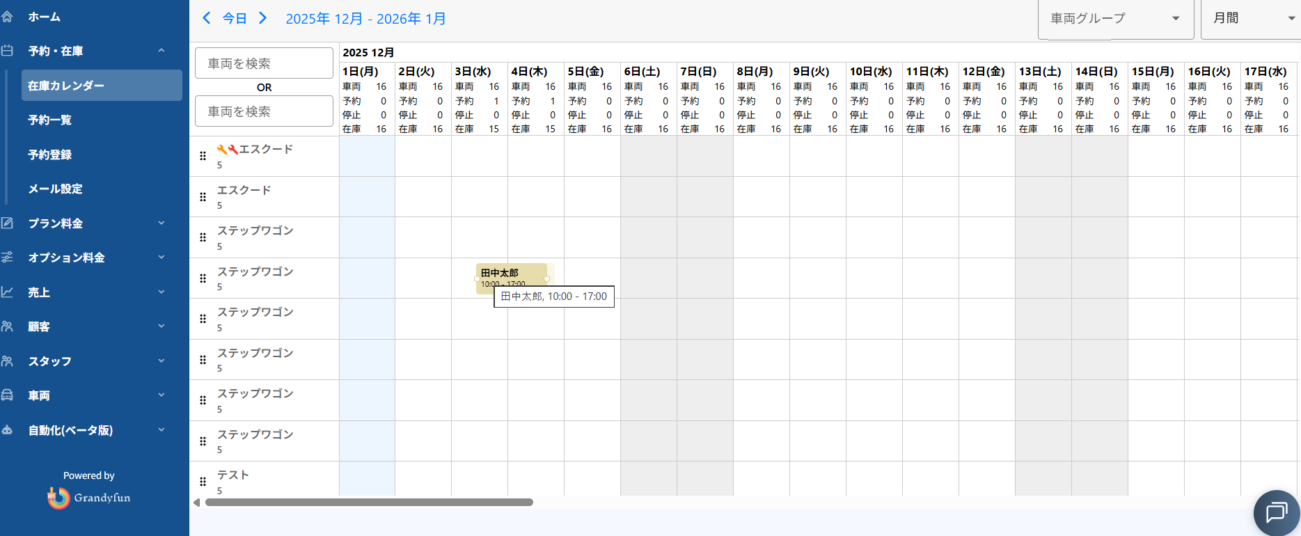 縦軸が「日付」、横軸が「車両一覧」となっており、予約や在庫状況を直感的に把握できます。
