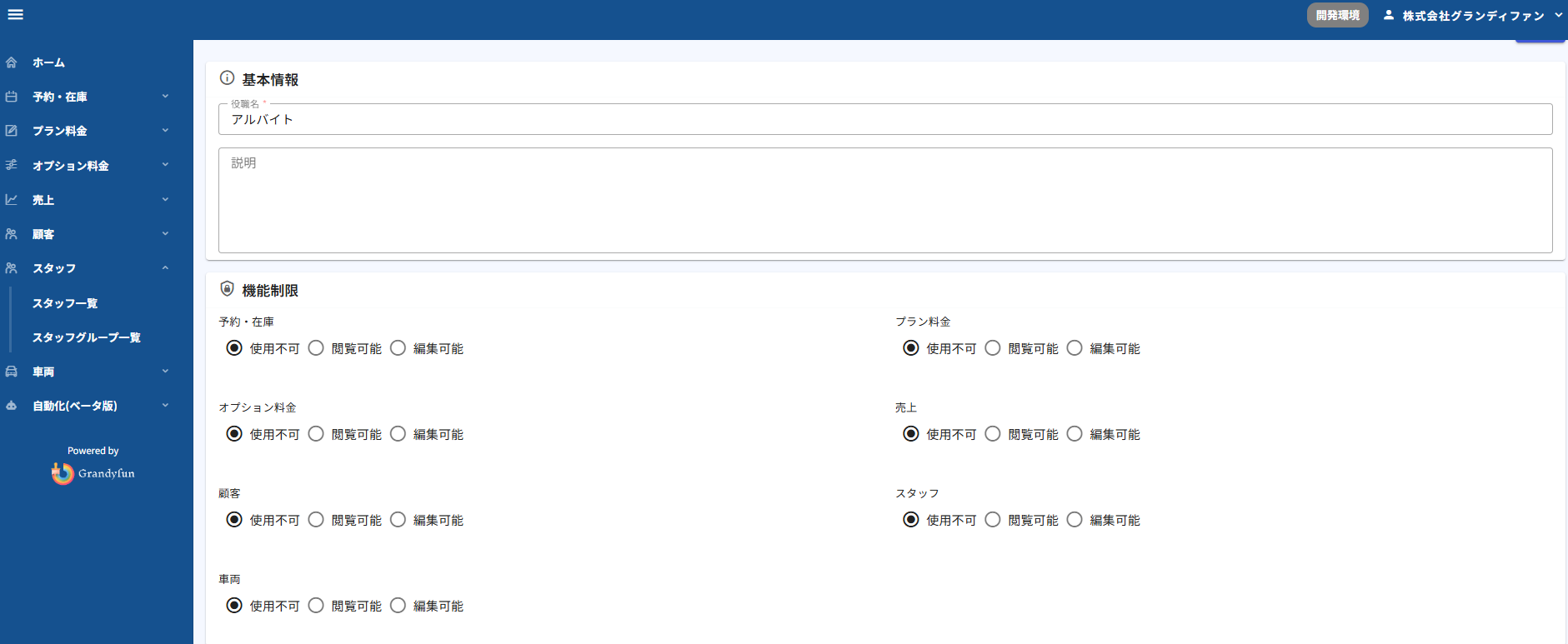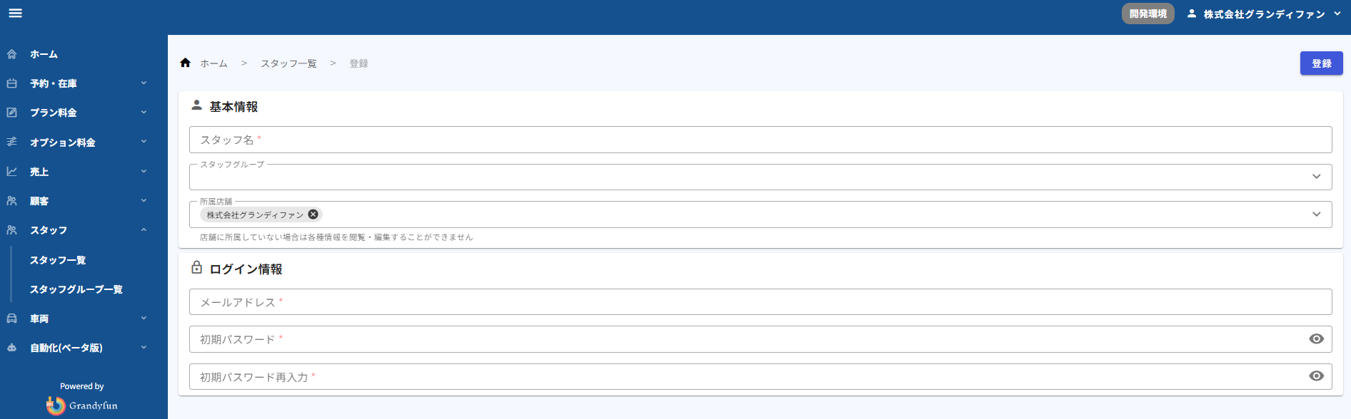 「スタッフ」とは、グランドレンタカーの管理システムにログインできるアカウントを指します。各スタッフには「ログイン権限」が与えられ、それぞれの業務に必要な操作を行えるようにカスタマイズ可能です。スタッフは管理者、社員、アルバイトなど、役割や責任に応じて異なる権限を設定できます。